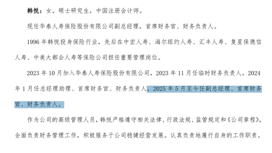 韩悦则是补位华泰人寿副总经理职位,同时任该司首席财务官、财务负责人,拥有硕士研究生学历,中国注册会计师资格。韩悦进入保险业已有29年,曾在多家合资、外资保司任职。1996年至2002年,韩悦在中宏人寿先后任高级财务主管、审计经理。2002年至2008年在海尔纽约人寿先后任高级财务及投资总监、财务负责人。2008年至2010年在汇丰人寿任首席财务官、财务负责人。2011年至2015年在复星保德信人寿任财务总监、财务负责人。2015年至2017年在中宏人寿任财务总监。2017 年7月至2023年8月在中美联泰大都会人寿任财务部负责人。2023 年10月加入华泰人寿,2023年11月任临时财务负责人,次年1月任总经理助理、首席财务官、财务负责人,今年5月升任副总经理,同时任首席财务官、财务负责人职务。