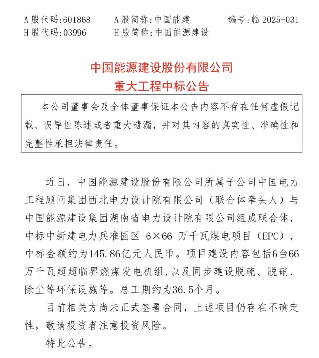 5月28日晚间,中国能建公告披露,公司子公司中国电力工程顾问集团西北电力设计院有限公司(联合体牵头人)与中国能源建设集团湖南省电力设计院有限公司组成联合体,中标中新建电力兵准园区6×66万千瓦煤电项目(EPC),中标金额约为145.86亿元。
