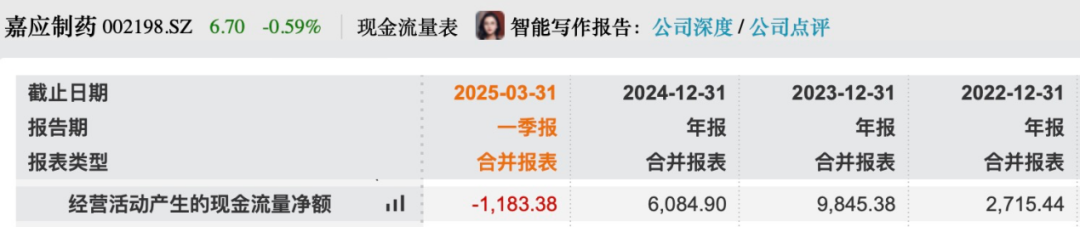 此外,2025年一季度公司实现营业总收入1.22亿元,同比增长28.83%;净利润为1540.33万元,同比增长197.23%。虽业绩有所回暖,但嘉应制药现金流“失血”严重,2025年一季度,嘉应制药经营活动产生的现金流量净额同比骤降193.73%至-1183.38万元。
